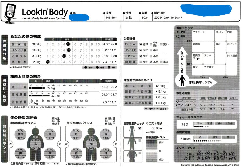 この中でも「2.脂肪の量」は最も時間をかけて取り組んで、現時点で最も成果が出ていると思います。ちょうど5日前にジムでInBody測定をして頂けたので結果を貼り付けます。初めて測ってもらったので、数値の程度が良くわかっていないのですが、ジムの店員さんは「こんな数値初めて見ました」って言っていました。これはお世辞かもしれないけど、確かに体脂肪率は低いです。