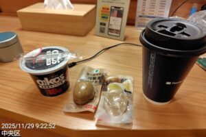ホテルのロビーからFamilyMartに直結のドアがあったので上着を持たずに買いに行ったのですが、コーヒーマシンが表側の自動ドアの真ん前にあって、コーヒーLを作っている間は寒さにさらされ続けました。本当に寒い〜。