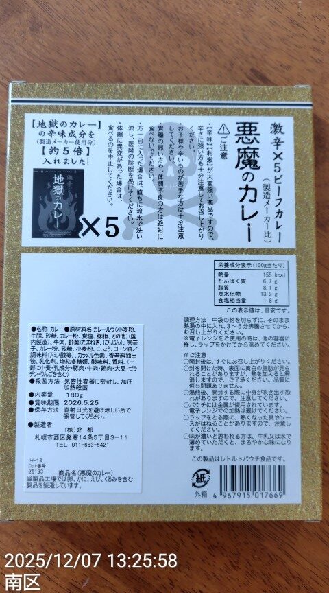 北海道の自分土産に『悪魔のカレー』という名のレトルトカレーを買ってきました。