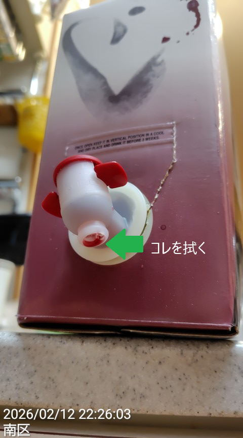 画像にある紫色の汚れはワインです。我が家では(安いので)箱ワインを飲むのですが、注ぎ口を毎回ティッシュで拭かないと数滴残ったワインが垂れて周り(特に冷蔵庫内)を汚してしまいます。