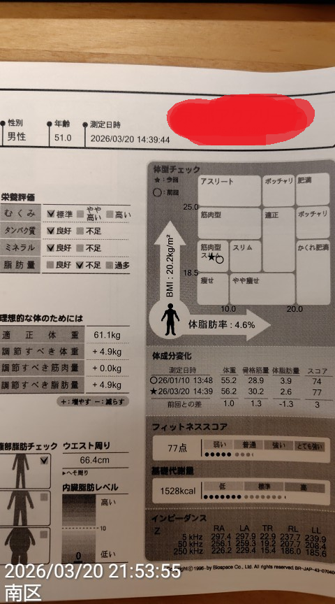 体重が前回より1kgも増えていましたが、なんと体脂肪率が4.6%と激減です。